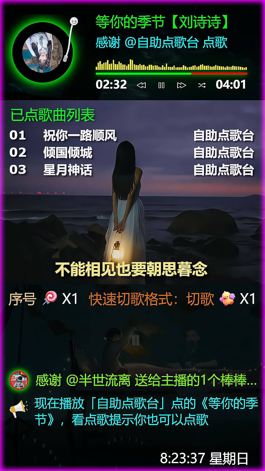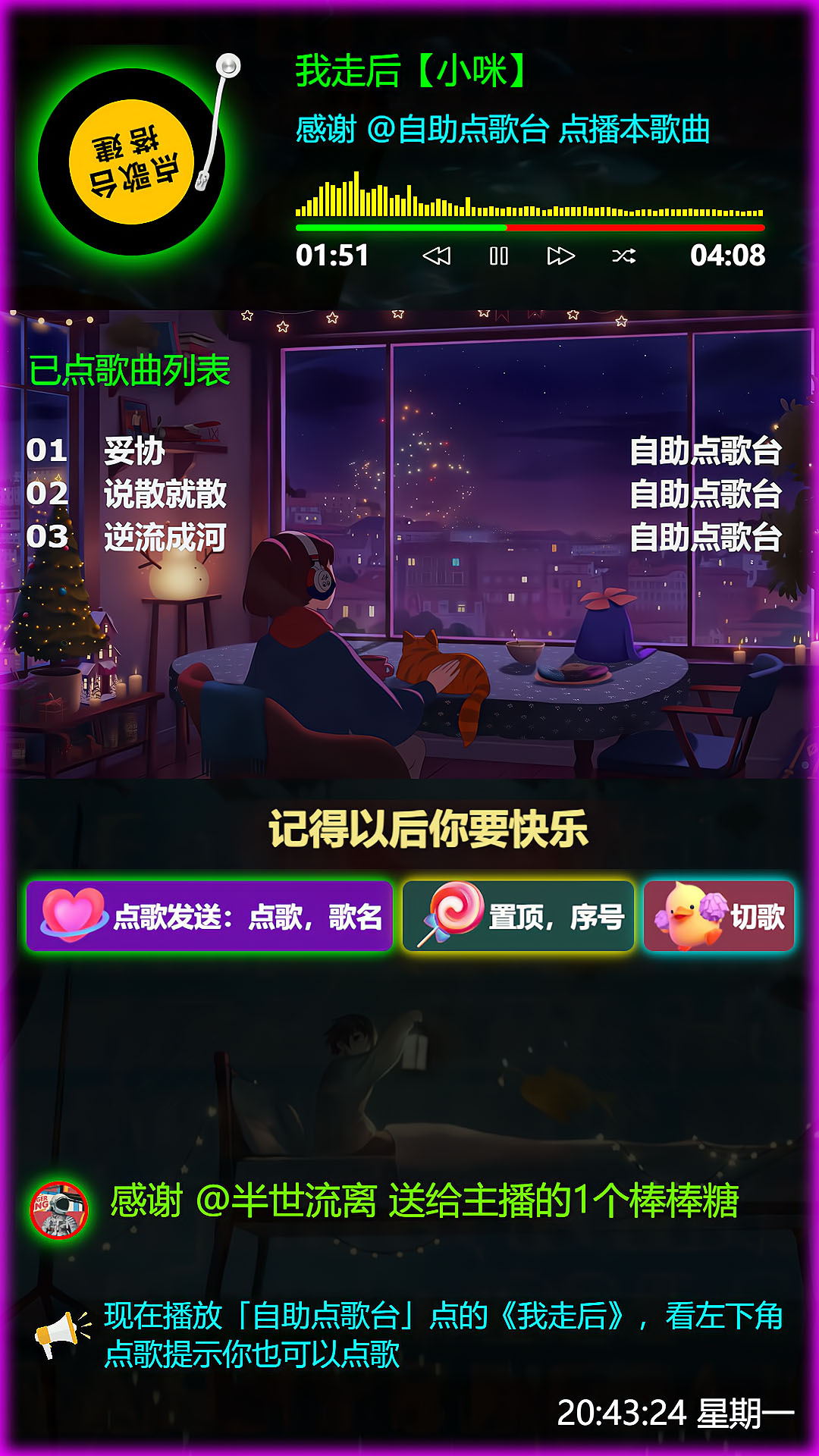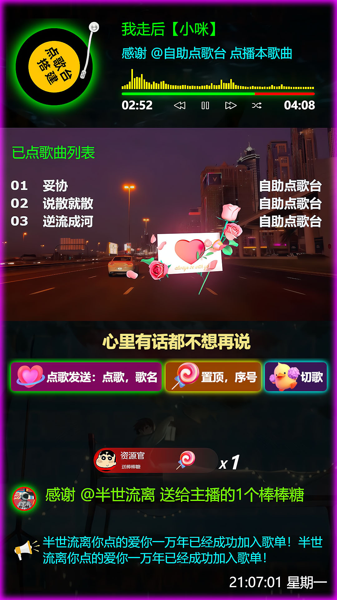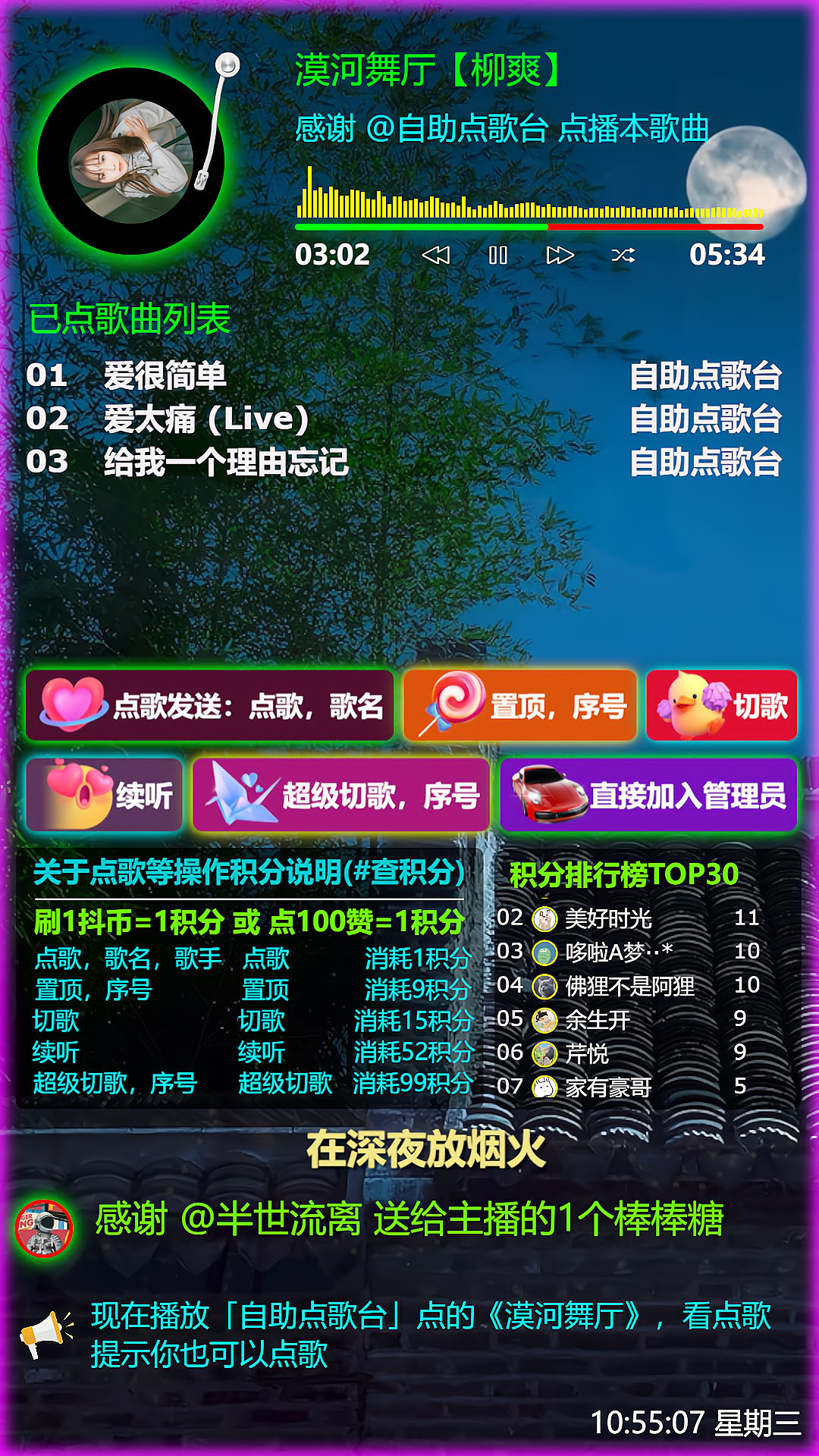 支持功能:支持礼物或者积分点歌、置顶、切歌、续听、删歌、超级切歌,支持语音播报、文字弹幕播报,支持冷场讲解、礼物感谢、关注感谢、点赞感谢、直播间进人欢迎、关键词智能回复,支持普通用户组、粉丝团用户组、VIP用户组、管理员用户组独立自定义积分,支持阿里云等几百种男生女生普通话及方言发音模型,支持震撼唯美礼物特效、头像飘屏、贵宾席座位等功能