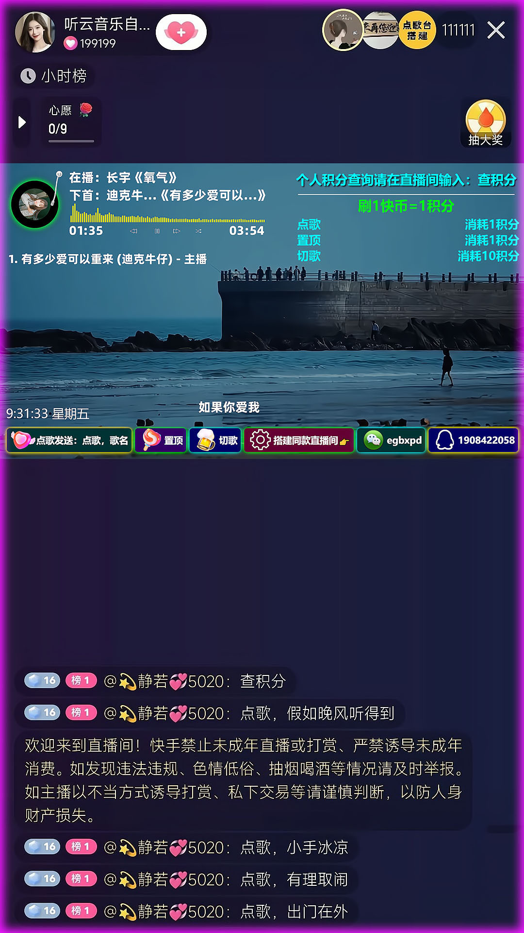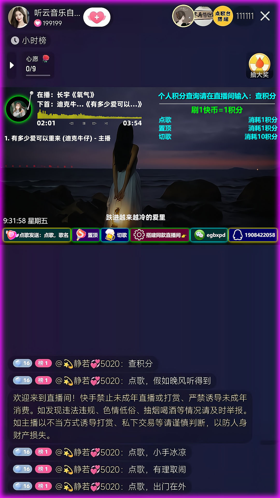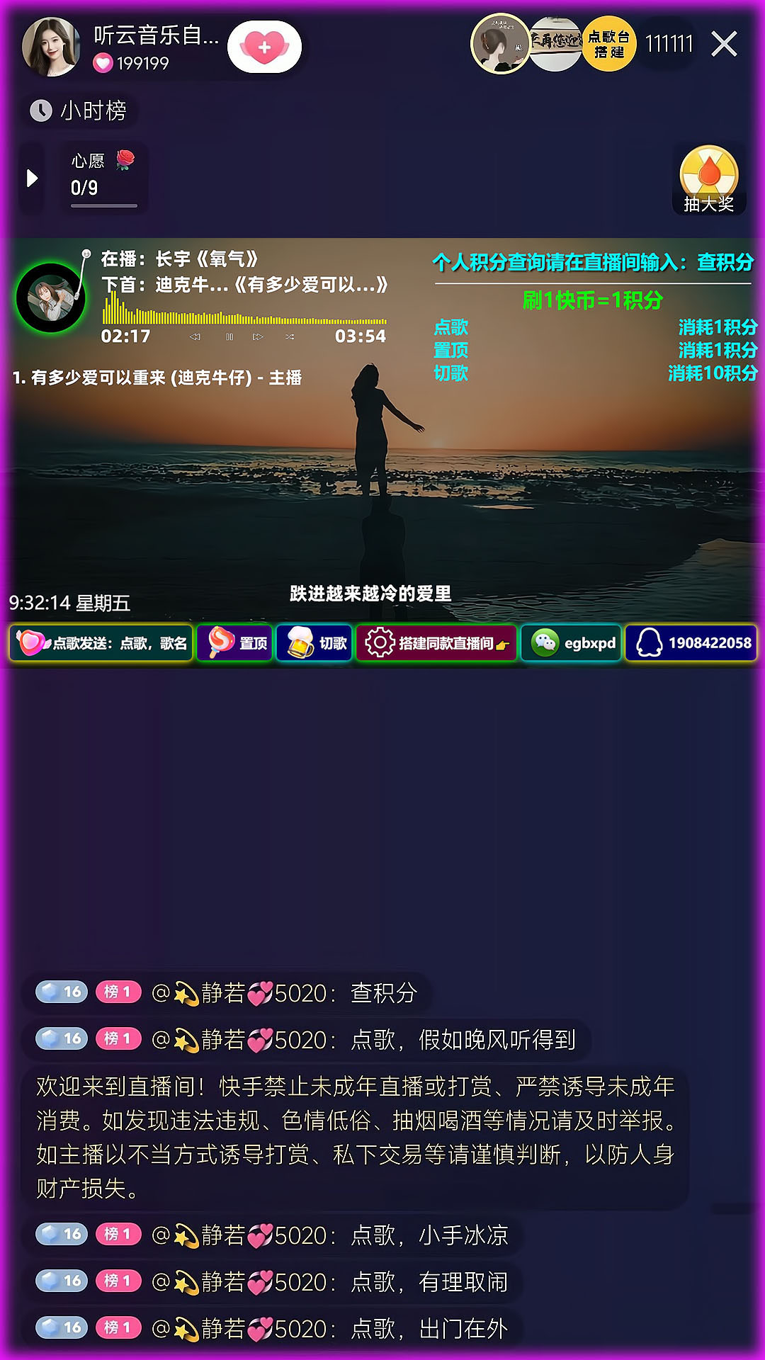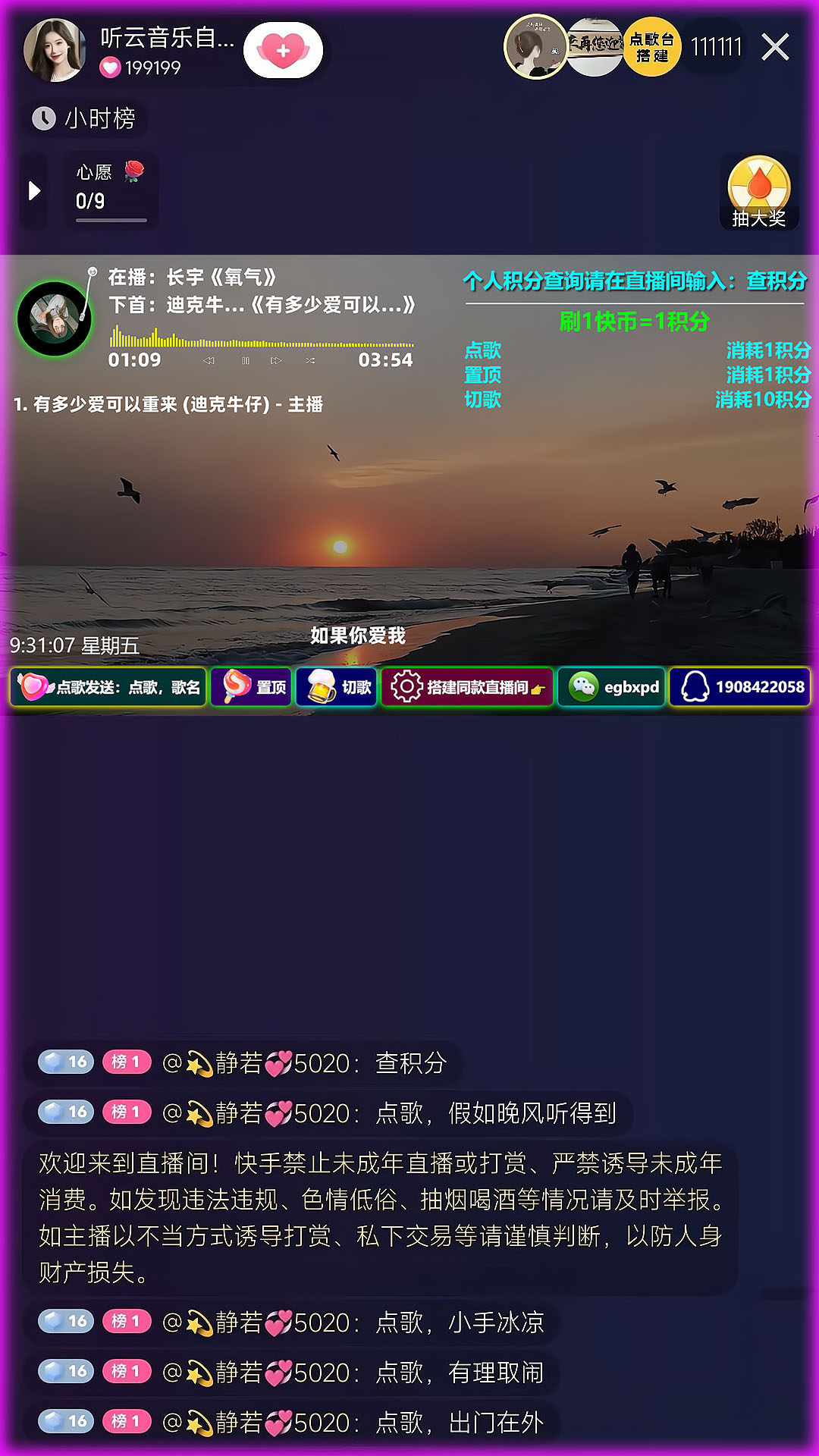 支持功能:支持礼物或者积分点歌、置顶、切歌、续听、删歌、超级切歌,支持语音播报、文字弹幕播报,支持冷场讲解、礼物感谢、关注感谢、点赞感谢、直播间进人欢迎、关键词智能回复,支持普通用户组、粉丝团用户组、VIP用户组、管理员用户组独立自定义积分,支持阿里云等几百种男生女生普通话及方言发音模型,支持震撼唯美礼物特效、头像飘屏、贵宾席座位等功能