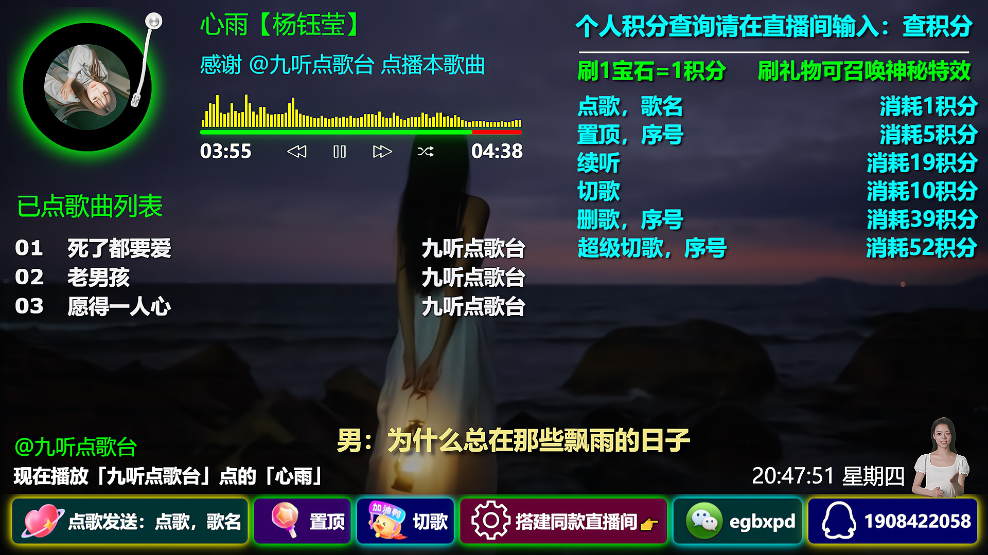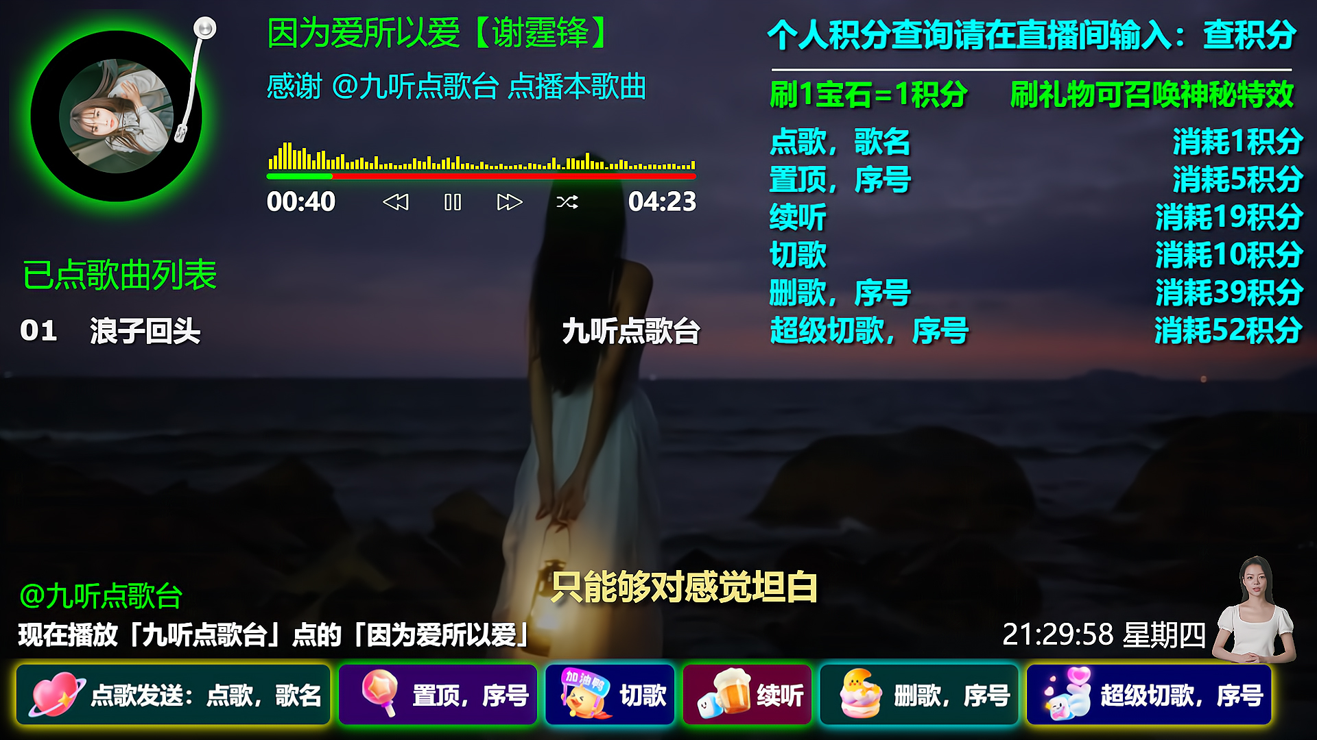 支持功能:支持礼物或者积分点歌、置顶、切歌、续听、删歌、超级切歌,支持语音播报、文字弹幕播报,支持冷场讲解、礼物感谢、关注感谢、点赞感谢、直播间进人欢迎、关键词智能回复,支持普通用户组、粉丝团用户组、VIP用户组、管理员用户组独立自定义积分,支持阿里云等几百种男生女生普通话及方言发音模型,支持震撼唯美礼物特效、头像飘屏、贵宾席座位等功能