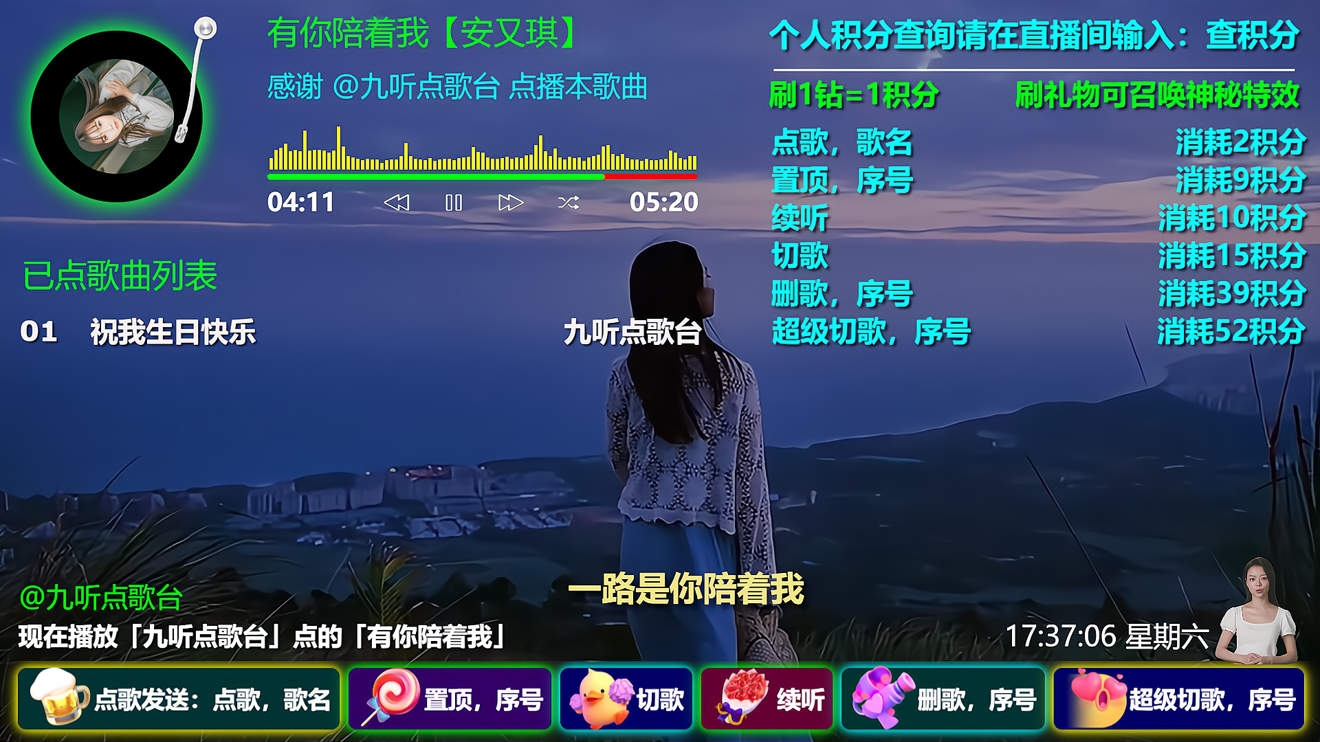 支持功能:支持礼物或者积分点歌、置顶、切歌、续听、删歌、超级切歌,支持语音播报、文字弹幕播报,支持冷场讲解、礼物感谢、关注感谢、点赞感谢、直播间进人欢迎、关键词智能回复,支持普通用户组、粉丝团用户组、VIP用户组、管理员用户组独立自定义积分,支持阿里云等几百种男生女生普通话及方言发音模型,支持震撼唯美礼物特效、头像飘屏、贵宾席座位等功能