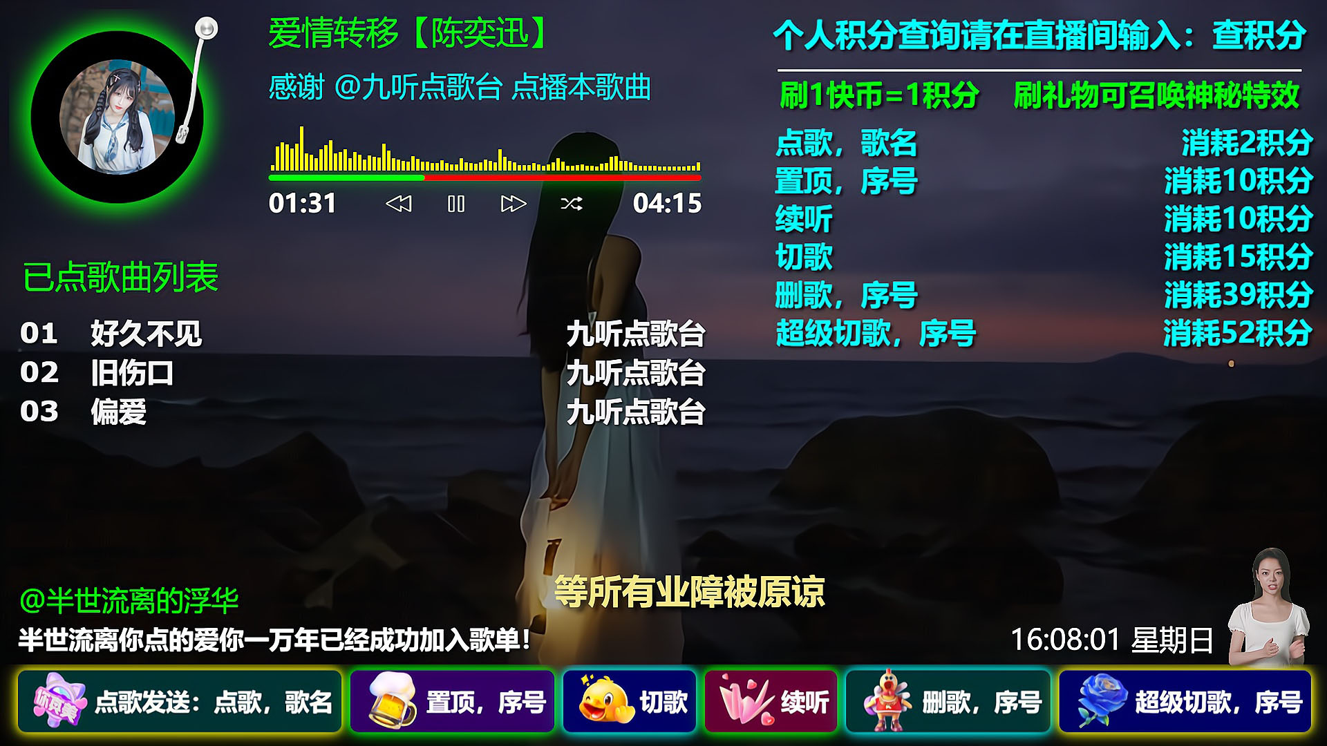 支持功能:支持礼物或者积分点歌、置顶、切歌、续听、删歌、超级切歌,支持语音播报、文字弹幕播报,支持冷场讲解、礼物感谢、关注感谢、点赞感谢、直播间进人欢迎、关键词智能回复,支持普通用户组、粉丝团用户组、VIP用户组、管理员用户组独立自定义积分,支持阿里云等几百种男生女生普通话及方言发音模型,支持震撼唯美礼物特效、头像飘屏、贵宾席座位等功能