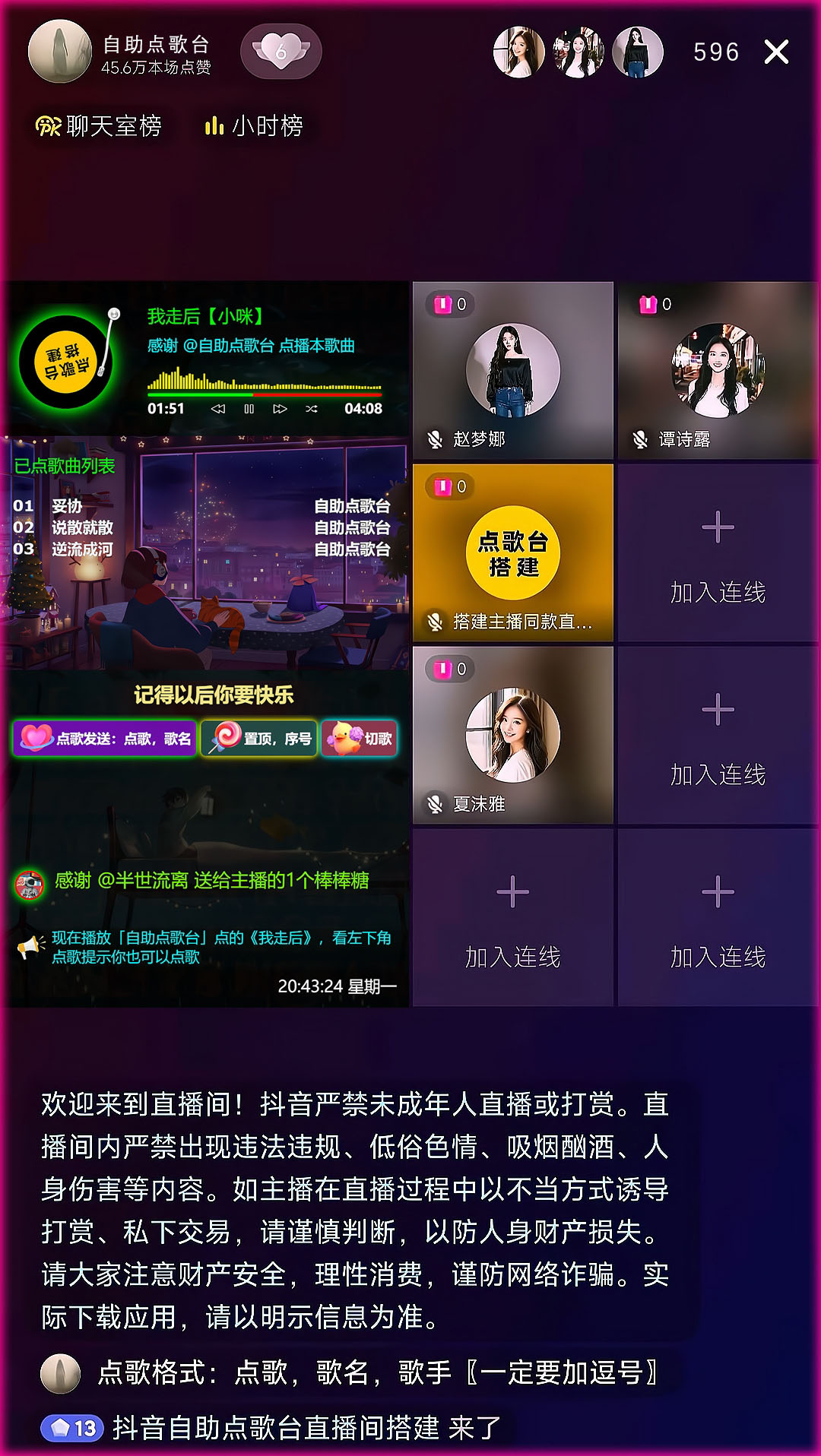 支持功能:支持礼物或者积分点歌、置顶、切歌、续听、删歌、超级切歌,支持语音播报、文字弹幕播报,支持冷场讲解、礼物感谢、关注感谢、点赞感谢、直播间进人欢迎、关键词智能回复,支持普通用户组、粉丝团用户组、VIP用户组、管理员用户组独立自定义积分,支持阿里云等几百种男生女生普通话及方言发音模型,支持震撼唯美礼物特效、头像飘屏、贵宾席座位等功能